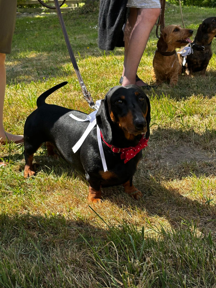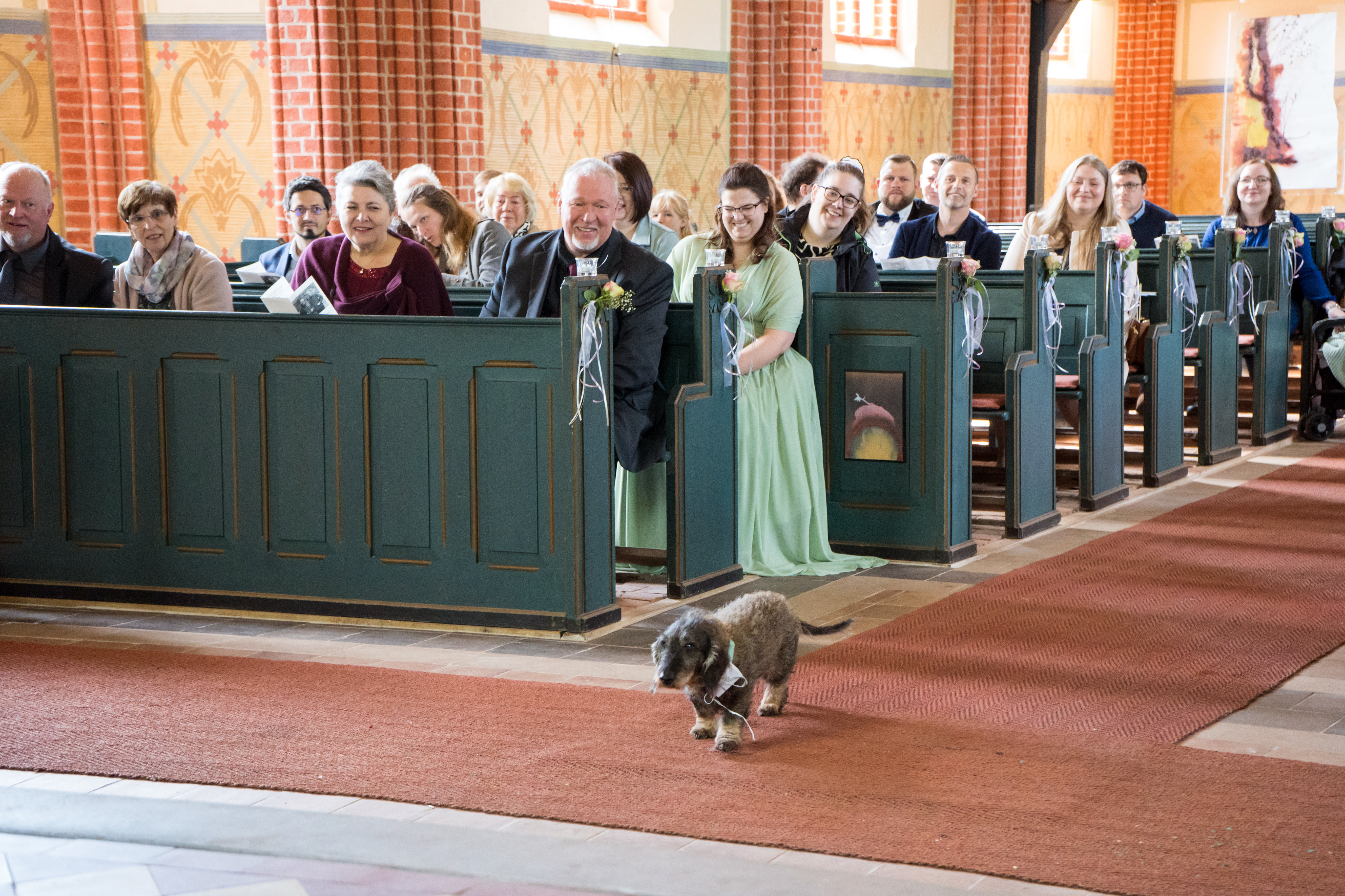 ich sagen, dass die Bänke und der Altar wunderschön geschmückt waren. Die Gäste kamen herein. Alle waren so glücklich und viel entspannter als sonst in der Kirche. Ich muss es wissen, ich bin regelmäßig dort, sodass ich mit Recht von meiner Kirche sprechen kann. Mein Rudel war etwas nervös, aber ich bin ganz der Dackel geblieben und behielt den Überblick.